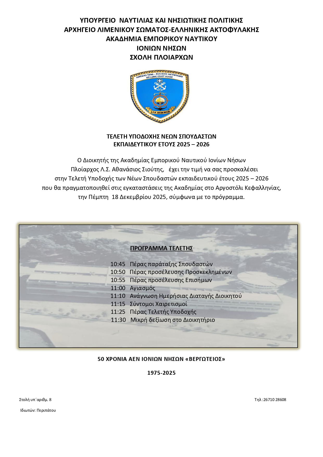 Την Πέμπτη 18 Δεκεμβρίου η τελετή υποδοχής νέων σπουδαστών στην Ακαδημία Εμπορικού Ναυτικού για το έτος 2025-2026