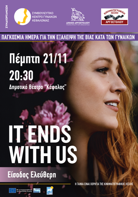 Την Πέμπτη 21 Νοεμβρίου στις 20:30 στο Δημοτικό Θέατρο «ο Κέφαλος» σε συν διοργάνωση με την Κινηματογραφική Λέσχη Αργοστολίου θα γίνει προβολή της αμερικανικής ρομαντικής δραματικής ταινίας “It ends with us” του 2024 σε σκηνοθεσία Justin Baldoni. Η είσοδος θα είναι ελεύθερη για το κοινό. Η ταινία είναι χορηγία της Κινηματογραφικής Λέσχης Αργοστολίου.