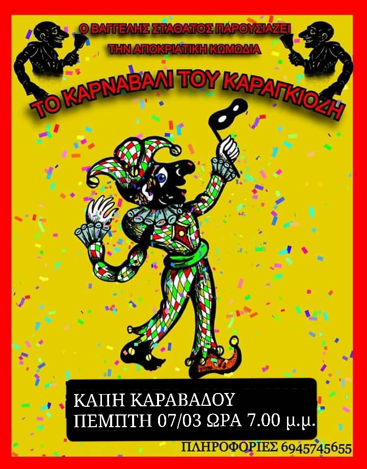 ü Στον ΚΑΡΑΒΑΔΟ στο χώρο του ΚΑΠΗ στις 7.00μμ, σας περιμένουμε όλους για μία άκρως αποκριάτικη παράσταση θεάτρου σκιών από τον Βαγγέλη Σταθάτο! Διοργάνωση, Δήμος Αργοστολίου.