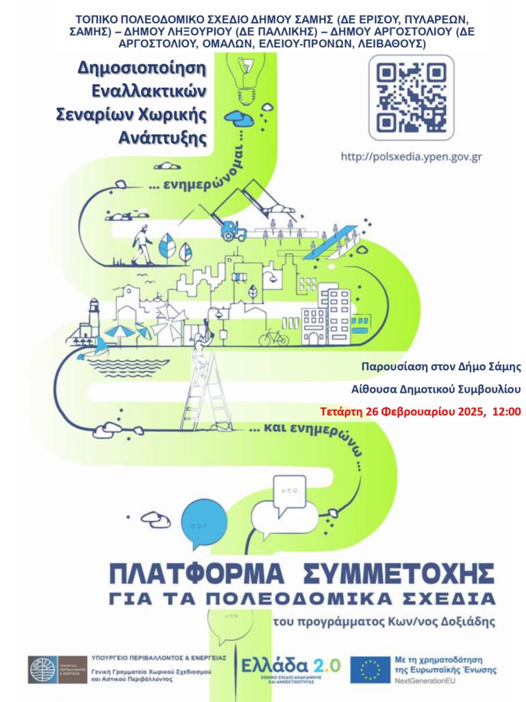 Σας γνωρίζουμε ότι, την Τετάρτη 26 Φεβρουαρίου 2025 και ώρα 12:00, στην αίθουσα του Δημοτικού Συμβουλίου, θα πραγματοποιηθεί παρουσίαση των Εναλλακτικών Σεναρίων της Μελέτης του Τοπικού Πολεοδομικού Σχεδίου (ΤΠΣ) ΔΗΜΩΝ ΣΑΜΗΣ – ΛΗΞΟΥΡΙΟΥ – ΑΡΓΟΣΤΟΛΙΟΥ για τον Δήμο Σάμης.