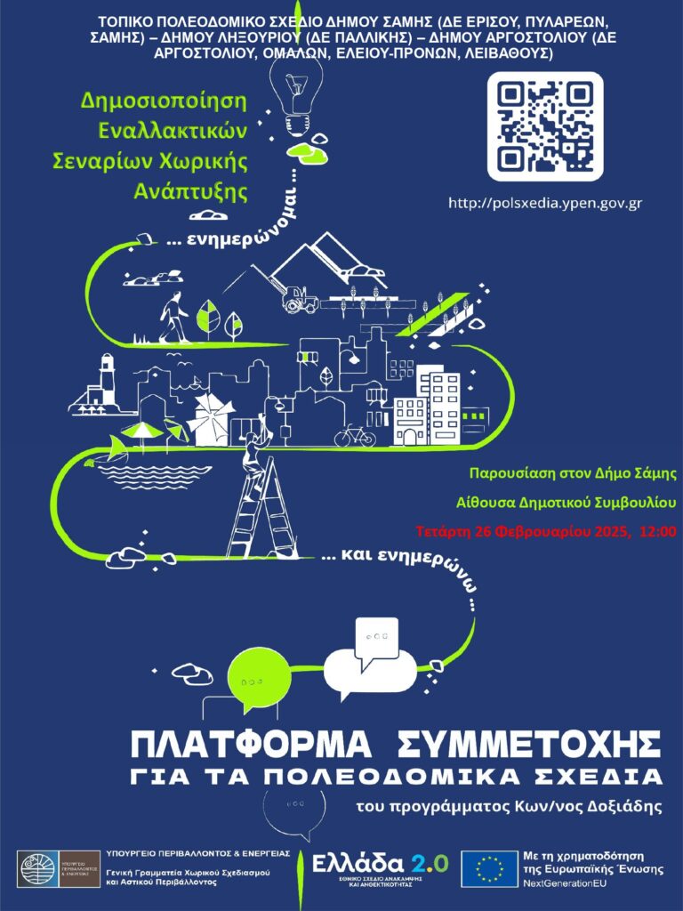 Σε συνέχεια της από 21-2-2025 ανακοίνωσης σχετικά με την παρουσίαση την Τετάρτη 26 Φεβρουαρίου 2025 και ώρα 12:00 των Εναλλακτικών Σεναρίων της Μελέτης του Τοπικού Πολεοδομικού Σχεδίου (ΤΠΣ) ΔΗΜΩΝ ΣΑΜΗΣ – ΛΗΞΟΥΡΙΟΥ – ΑΡΓΟΣΤΟΛΙΟΥ για τον Δήμο Σάμης, σας γνωρίζουμε ότι μπορεί όποιος επιθυμεί να την παρακολουθήσει ζωντανά μέσω του κάτωθι Link