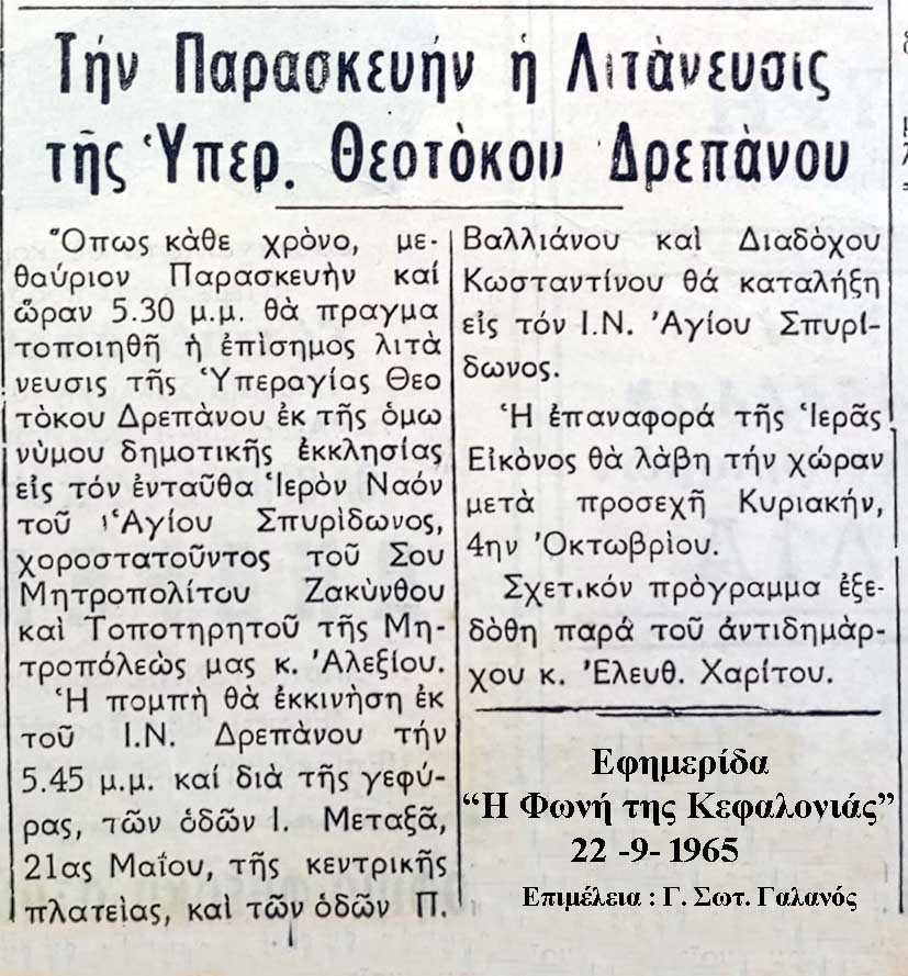 « τον Σεπτέμβριο του 1969, καθώς τα έργα πάνω στη Γέφυρα δεν είχαν τελειώσει, η καθιερωμένη λιτάνευση της Παναγίας του Δραπάνου πραγματοποιήθηκε από το γύρο του Κουτάβου με στολισμένο για την περίσταση όχημα (κατά μαρτυρίες με τρίκυκλο), παρόλο που ο ανάδοχος εργολάβος «προθύμως προέβη εις την τοποθέτηση προχείρου ξυλίνης γεφύρας». Αρχικά δε είχε ρυθμίσει να πραγματοποιείτο η μεταφορά της ιεράς εικόνας με τον «Ταξιάρχη», πορθμείο συγκοινωνίας μεταξύ Αργοστολίου και Ληξουρίου. Όμως η προσέγγιση του σκάφους ήταν αδύνατη και έτσι προτάθηκε- και εφαρμόστηκε – η μεταφορά της ιεράς εικόνας «δια της περιφερειακής οδού Κουτάβου». (Βλ. Εφημ. «Το Μέλλον» Αρ, Φυλ. 264 έως 268, του 1969).