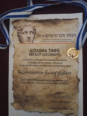 O ΚΕΦΑΛΟΝΙΤΗΣ KΩΣΤΑΣ ΕΥΑΓΓΕΛΑΤΟΣ ΗΤΑΝ ΑΝΑΜΕΣΑ ΣΤΙΣ ΔΙΕΘΝΕΙΣ ΠΡΟΣΩΠΙΚΌΤΗΤΕΣ ΠΟΥ ΕΛΑΒΑΝ ΦΕΤΟΣ TO ΤΙΜΗΤΙΚΟ ΔΙΠΛΩΜΑ ΚΑΙ TO ΧΡΥΣΟ ΜΕΤΑΛΛΙΟ ΤΟΥ ΜΕΓΑΛΟΥ ΑΛΕΞΑΝΔΡΟΥ ΣΤΗΝ ΑΠΟΝΟΜΗ ΠΟΥ ΠΡΑΓΜΑΤΟΠΟΙΗΘΗΚΕ ΑΠΟ “ΤΟ ΚΑΦΕΝΕΙΟ ΤΩΝ ΙΔΕΩΝ” ΣΤΗΝ ΑΙΘΟΥΣΑ ΔΗΜΗΤΡΗΣ ΜΠΟΓΡΗΣ ΤΟΥ ΔΗΜΑΡΧΕΙΟΥ ΤΗΣ ΣΑΛΑΜΙΝΑΣ.