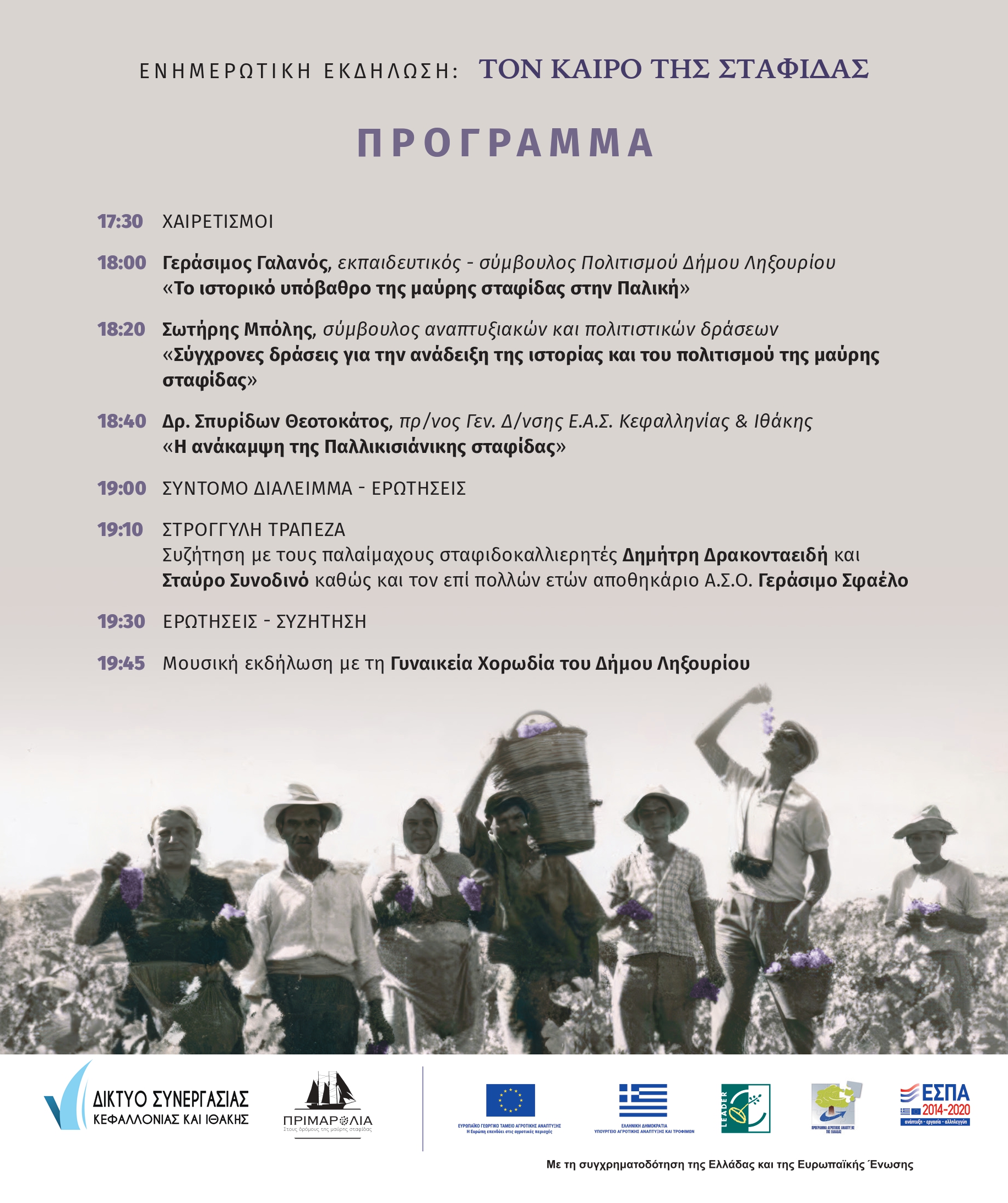 Θα μιλήσουν οι: Γεράσιμος Σωτ. Γαλανός, εκπαιδευτικός-σύμβουλος Πολιτισμού Δήμου Ληξουρίου, Σωτήρης Μπόλης, σύμβουλος αναπτυξιακών και πολιτιστικών δράσεων, Δρ. Σπυρίδων Α. Θεοτοκάτος, πρ/νος Γεν. Δ/νσης Ε.Α.Σ. Κεφαλληνίας & Ιθάκης. Θα ακολουθήσει συζήτηση με τους παλαίμαχους σταφιδοκαλλιεργητές Δημήτρη Δρακονταειδή, Σταύρο Συνοδινό και τον επί πολλών ετών αποθηκάριο Α.Σ.Ο. Γεράσιμο Σφαέλο.