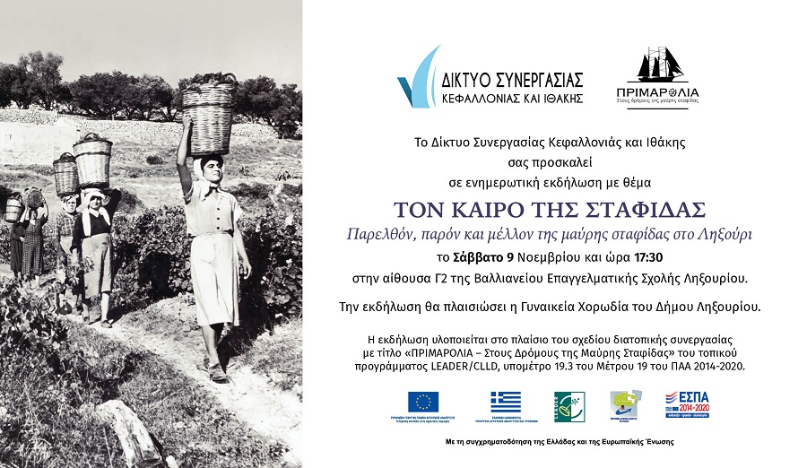 Το Δίκτυο Συνεργασίας Κεφαλλονιάς και Ιθάκης, στο πλαίσιο του σχεδίου διατοπικής συνεργασίας με τίτλο «ΠΡIΜΑΡΟΛΙΑ – Στους Δρόμους της Μαύρης Σταφίδας» του τοπικού προγράμματος CLLD/LEADER, υπομέτρο 19.3 του Μέτρου 19 του ΠΑΑ 2014-2020, σας προσκαλεί στην ενημερωτική εκδήλωση,