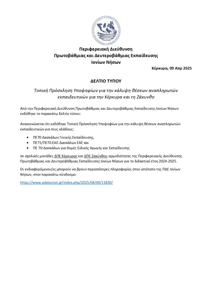 Τοπική Πρόσκληση για την κάλυψη Αναπληρωτών Δασκάλων εκπαιδευτικών για Κέρκυρα και Ζάκυνθο