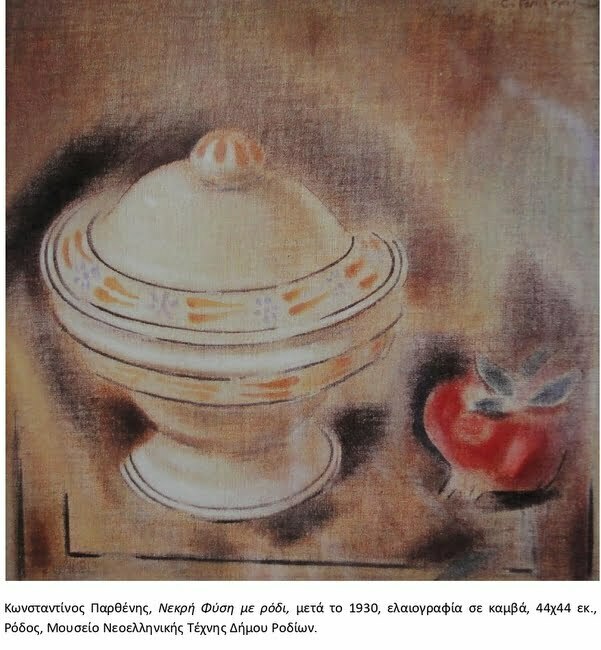 Δεν αποκλείεται να τη σχεδίασε τότε και να την απέδωσε ελαιογραφικά αργότερα. Στον πίνακα του Παρθένη επαναλαμβάνεται ακριβώς το σχήμα του αγγείου, αλλά με μικρές διαφοροποιήσεις στη διακόσμηση: στο πώμα τα γεωμετρικά μοτίβα έχουν αντικατασταθεί από τα σχηματοποιημένα «φύλλα» της σουπιέρας του Κοργιαλενείου Μουσείου, ενώ στη ζώνη στο κύριο σώμα του αγγείου έχουν παραλειφθεί τα σχηματοποιημένα άνθη. Γενικά η απόδοση των διακοσμητικών στοιχείων είναι πιο ελεύθερη στον πίνακα του Παρθένη.