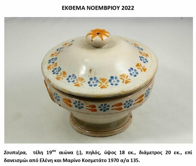 Ένα από τα πρώτα αντικείμενα που εντάχθηκαν στις συλλογές του Κοργιαλενείου Μουσείου, συγκεκριμένα το εκατοστό τριακοστό πέμπτο, είναι και η σουπιέρα που παρουσιάζουμε εδώ. Μου έχει δοθεί και άλλες φορές η ευκαιρία να υπενθυμίσω ότι οι συλλογές του Κοργιαλενείου Μουσείου άρχισαν να συγκροτούνται από αντικείμενα που ξέθαψε από τα ερείπια των σεισμών 1953 ο Μαρίνος Κοσμετάτος και από αντικείμενα που το ζεύγος Ελένης και Μαρίνου Κοσμετάτου προσέφεραν από τις συλλογές τους ως δώρα ή ως διαρκή δάνεια. Στη συνέχεια προσείλκυσαν δωρεές πολλών ιδιωτών, οι οποίες συνεχίζονται έως και σήμερα. Από ιδιώτες προέρχονται και άλλα αντικείμενα, κυρίως έπιπλα, τα οποία οι ιδιοκτήτες τους ή οι κληρονόμοι τους τα πετούσαν ως άχρηστα στα πεζοδρόμια από όπου τα περιμάζευε ο Μαρίνος Κοσμετάτος και, αφού τα επισκεύαζε σε ντόπιους κυρίως καλλιτέχνες- επιπλοποιούς και τα συντηρούσε τα παραχωρούσε στις συλλογές του Κοργιαλενείου Μουσείου. Η παρούσα σουπιέρα εντάχθηκε στη λαογραφική συλλογή του, η οποία συγκροτείται από αντικείμενα που χρησιμοποιούσε στις καθημερινές του οικιακές και επαγγελματικές ασχολίες ο γεωργοκτηνοτροφικός κόσμος της υπαίθρου.
