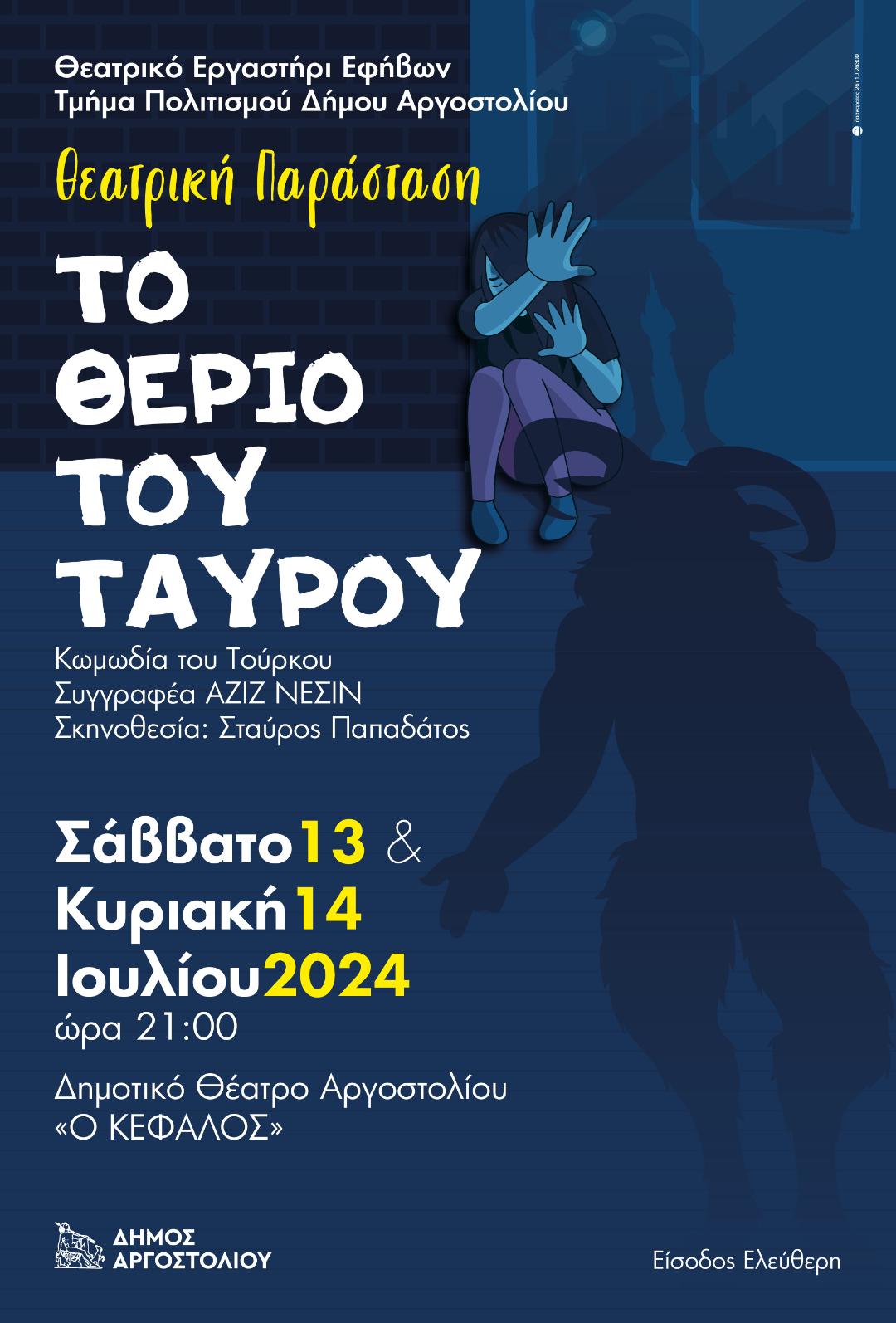 Το Σάββατο 13 & την Κυριακή 14 Ιουλίου στο Δημοτικό Θέατρο Αργοστολίου «Ο ΚΕΦΑΛΟΣ» και ώρα 9.00μμ., Το Θεατρικό Εργαστήρι Εφήβων του Τμήματος Πολιτισμού Δήμου Αργοστολίου παρουσιάζει την θεατρική παράσταση «ΤΟ ΘΕΡΙΟ ΤΟΥ ΤΑΥΡΟΥ» του ΑΖΙΖ ΝΕΣΙΝ. Σκηνοθεσία : Σταύρος Παπαδάτος.  Είσοδος Ελεύθερη.