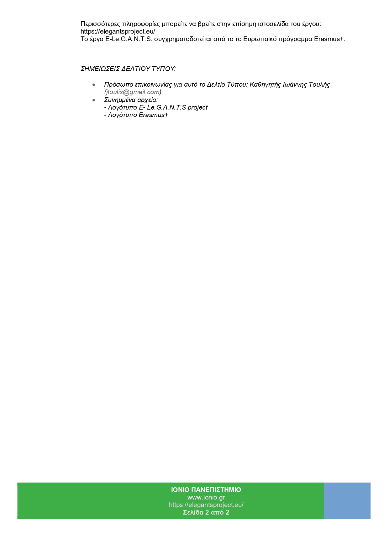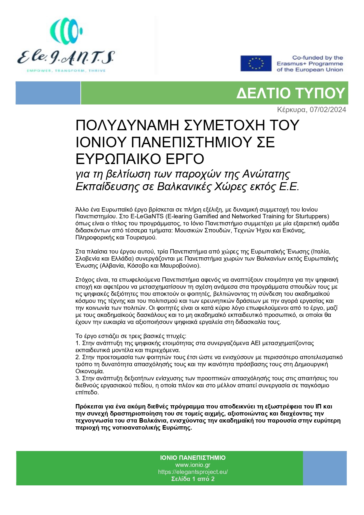 Το Ιόνιο Πανεπιστήμιο συμμετέχει στο πρόγραμμα ELEGANTS στα πλαίσια του έργου ERASMUS+