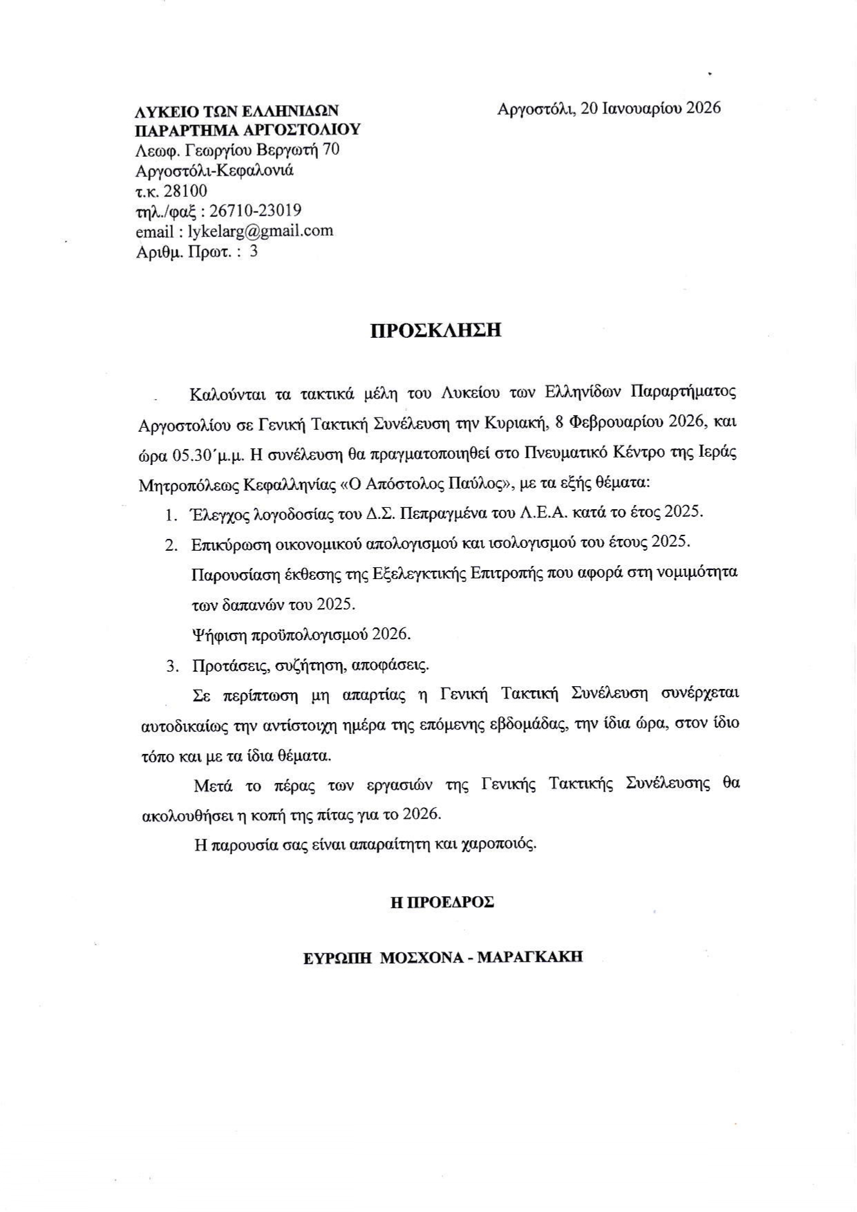 Το Λύκειο Ελληνίδων καλεί τα μέλη του σε Γενική Συνέλευση την Κυριακή 8 Φεβρουαρίου στο Πνευματικό Κέντρο “Απόστολος Παύλος”