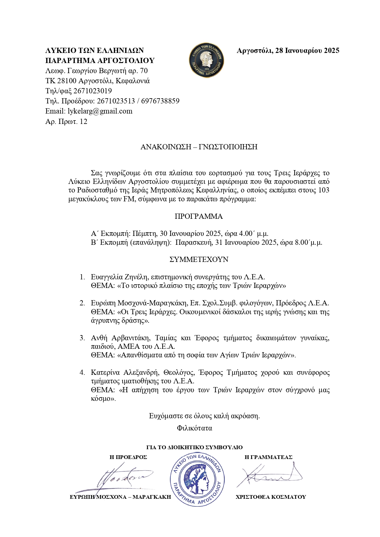 Το Λύκειο Ελληνίδων συμμετέχει στο αφιέρωμα του Ραδιοφωνικού Σταθμού της Μητρόπολης για τους Τρείς Ιεράρχες