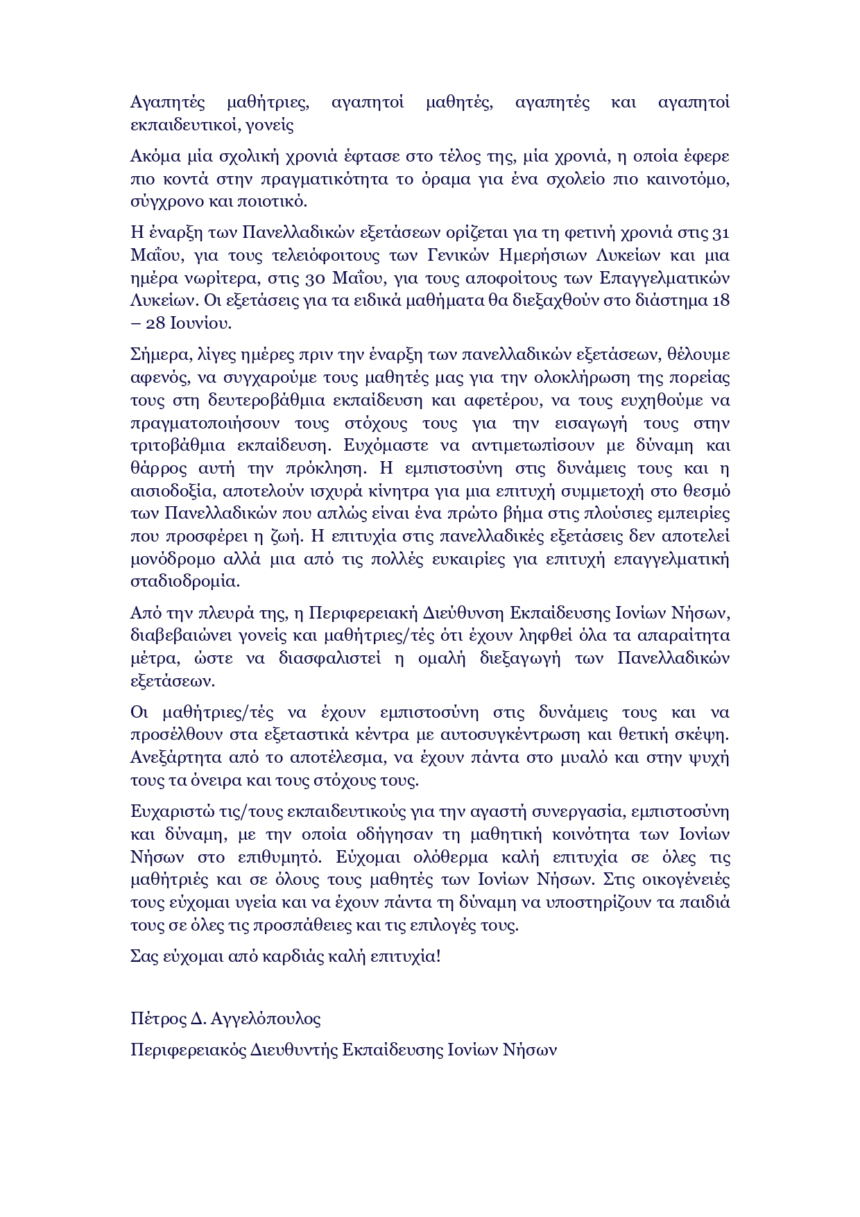Το μήνυμα των Πανελλαδικών του Περιφ Δντη Εκπαίδευσης Ιονίων Νήσων