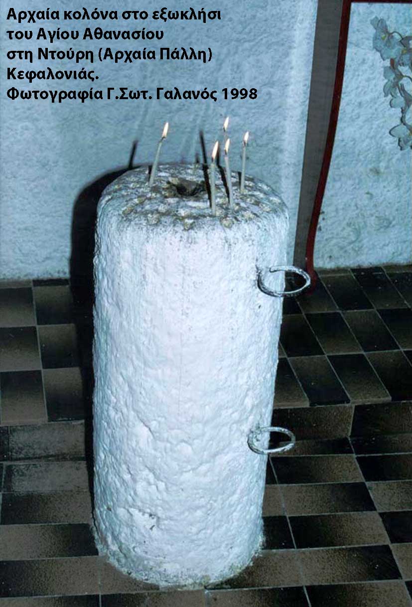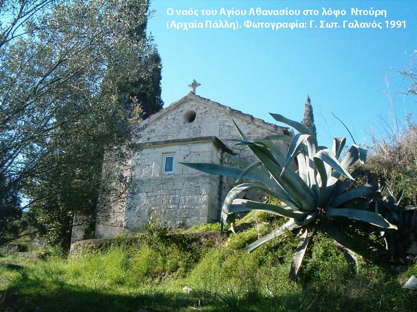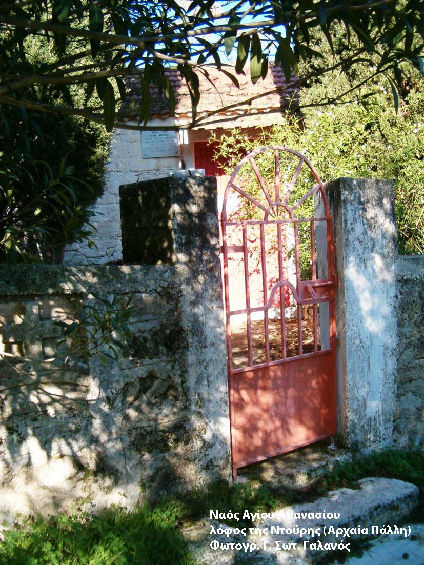 Στο λόφο που υπήρχε η αρχαία ακρόπολη και μέρος της παλαιάς πόλης της Κεφαλληνίας, Πάλλη, βρίσκεται σχεδόν στο κέντρο αυτού του βουνίσιου υψώματος , το ξωκλήσι του Αγίου Αθανασίου, κτισμένο πάνω σε αρχαίο ναό. Όλη αυτή την περιοχή την ονομάζουμε από παλιά, «Ντούρη», λέξη που προέρχεται παραλλαγμένη από την ιταλική TORRE, που ερμηνεύεται ως πύργος ή ακόμη και κάστρο, (Παλαιόκαστρο).
