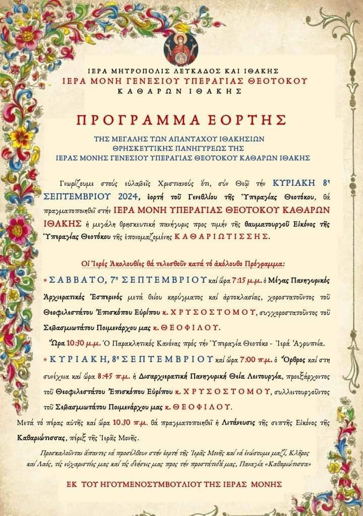 Το πρόγραμμα της εορτής του γενεθλίου της Υπεραγίας Θεοτόκου Καθαρών Ιθάκης