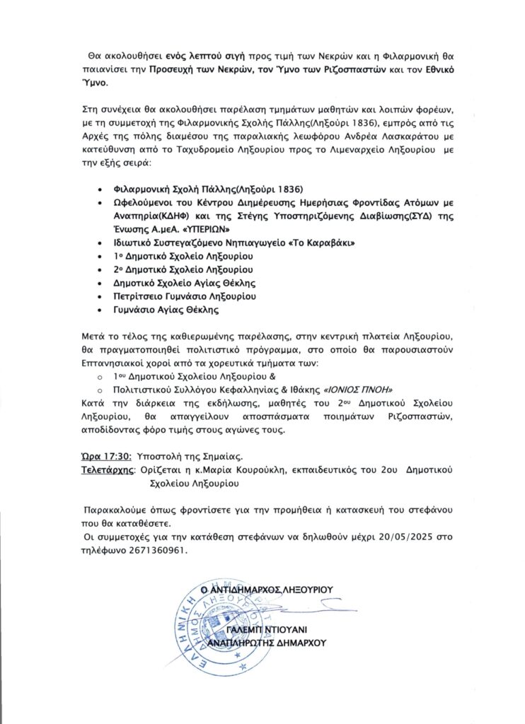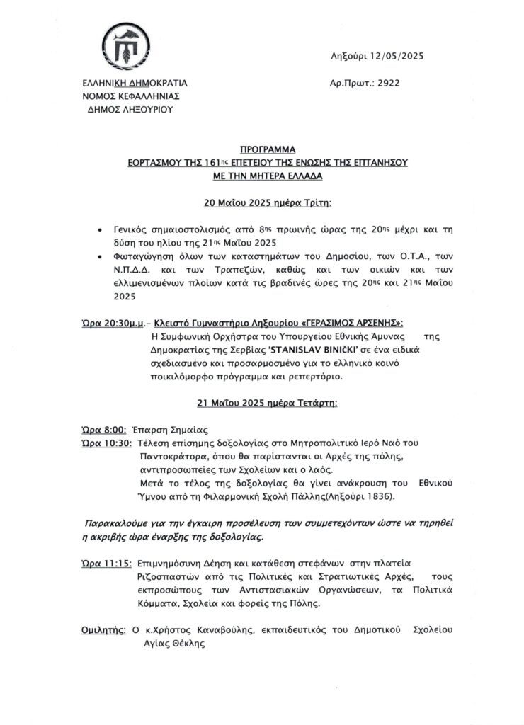 Το πρόγραμμα του εορτασμού της 161ης Επετείου της Ένωσης της Επτανήσου με την Μητέρα Ελλάδα στο Ληξούρι