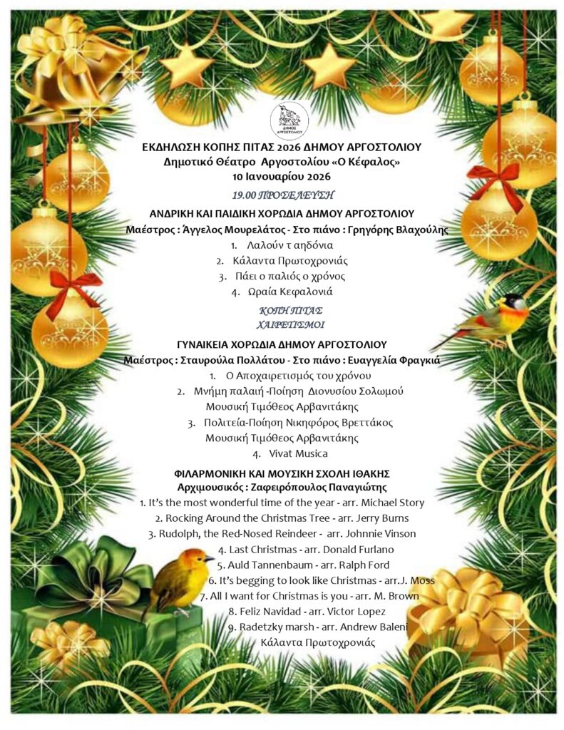 Ο Δήμαρχος Αργοστολίου Θεόφιλος Μιχαλάτος και το Δημοτικό Συμβούλιο, σας προσκαλούν να τιμήσετε με την παρουσία σας την κοπή της Πρωτοχρονιάτικης πίτας του Δήμου Αργοστολίου, το Σάββατο 10 Ιανουαρίου 2026 και ώρα 19.00 στο Δημοτικό Θέατρο Αργοστολίου ‘’Ο Κέφαλος’’.