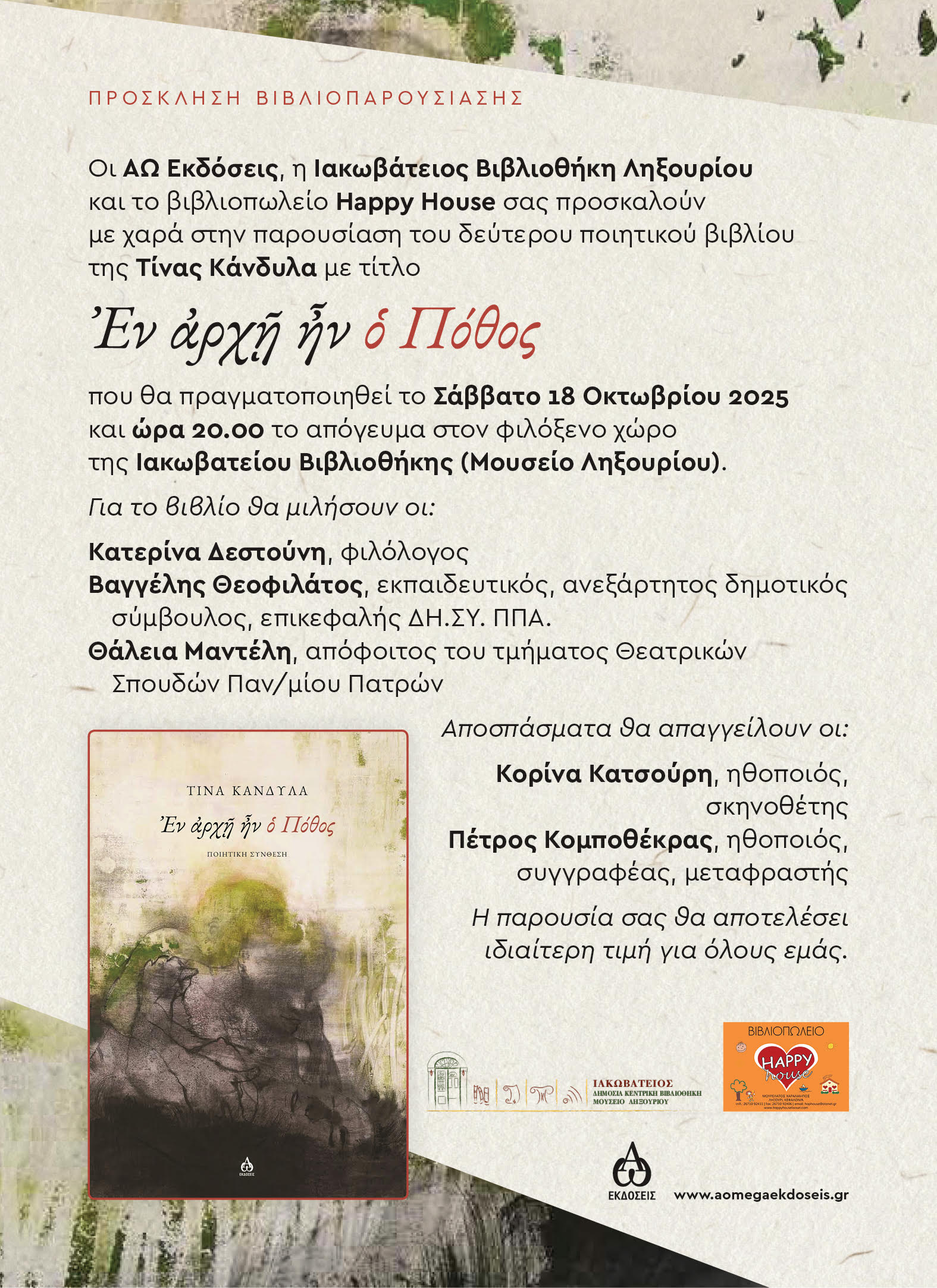 Η Ιακωβάτειος Βιβλιοθήκη, οι Εκδόσεις ΑΩ και το βιβλιοπωλείο Happy House θα παρουσιάσουν στο Μουσείο Ληξουρίου το Σάββατο, 18 Οκτωβρίου, 8  μ.μ., την ποιητική συλλογή της φιλολόγου Τίνας Κάνδυλα «Εν αρχή ήν ο Πόθος».