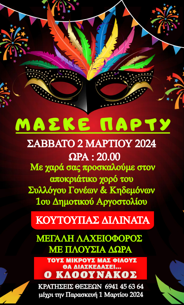 Το Σάββατο 2 Μαρτίου ο Σύλλογος Γονεων και Κηδεμόνων του 1ου Δημοτικού σχολείου διοργανώνει “Μασκέ Πάρτυ” στον Κούτουπα