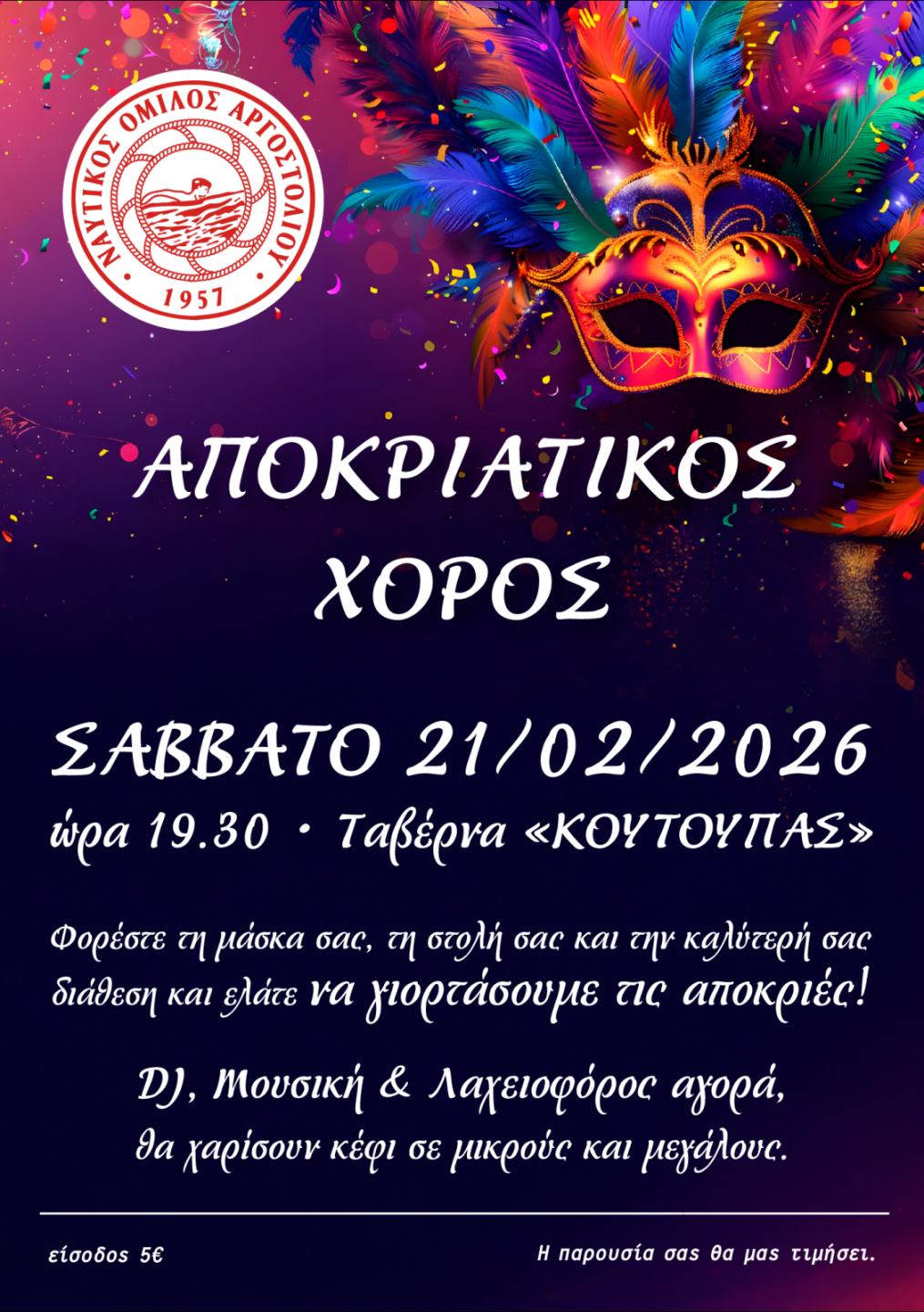 Το Σάββατο 21 Φεβρουαρίου στον Κούτουπα ο Αποκριάτικος Χορός του ΝΟΑ