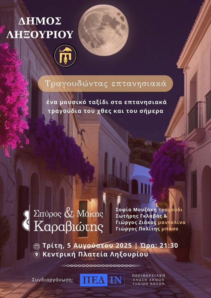 Ο Δήμος Ληξουρίου σας προσκαλεί σε μια μαγική μουσική βραδιά με τίτλο «Τραγουδώντας επτανησιακά», σήμερα Τρίτη 5 Αυγούστου 2025 και ώρα 21:30, στην Κεντρική Πλατεία Ληξουρίου.