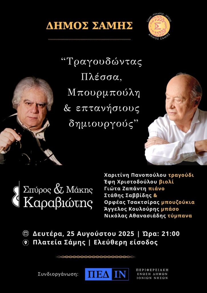 Ο Δήμος Σάμης σε συνεργασία με την Περιφερειακή Ένωση Δήμων Ιονίων Νήσων (ΠΕΔΙΝ) παρουσιάζει μια μοναδική μουσική βραδιά με τίτλο: «Τραγουδώντας Πλέσσα, Μπουρμπούλη & Επτανήσιους δημιουργούς». Τη Δευτέρα 25 Αυγούστου 2025, στην Πλατεία της Σάμης και ώρα 21:00, το κοινό θα έχει την ευκαιρία να απολαύσει ένα πλούσιο μουσικό πρόγραμμα με αγαπημένα τραγούδια κορυφαίων Ελλήνων δημιουργών.