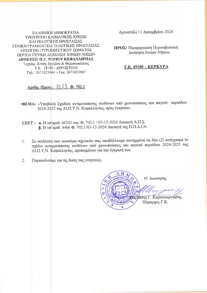 Υποβολή σχεδίου αντιμετώπισης κινδύνου από χιονοπτώσεις και παγετό