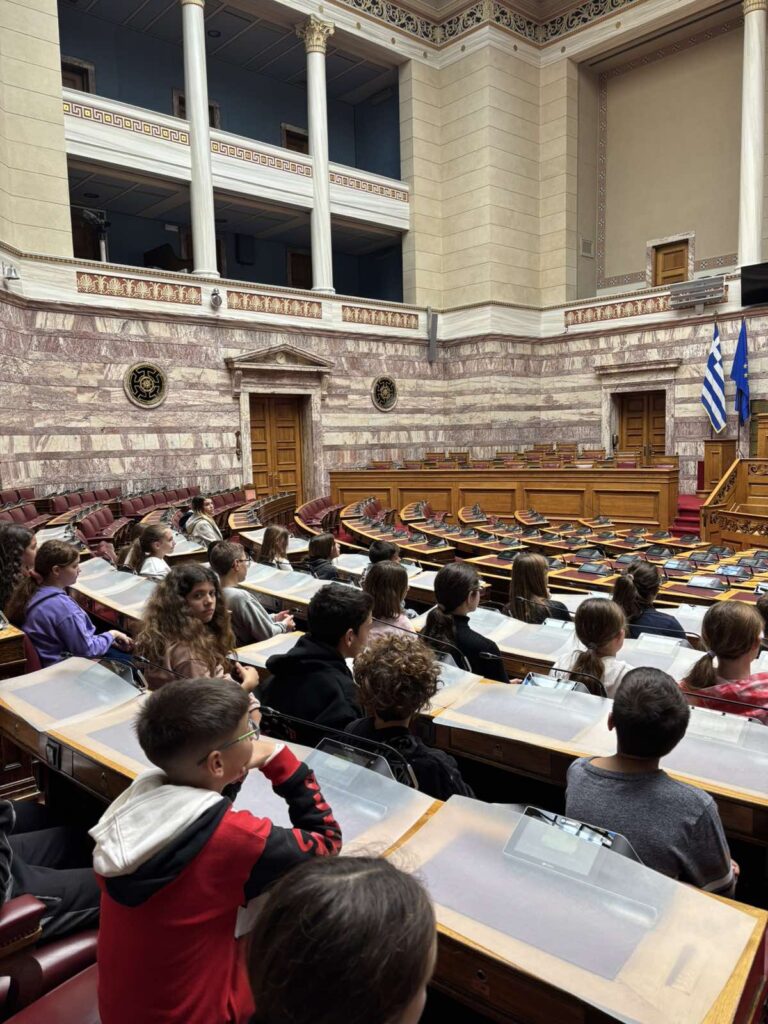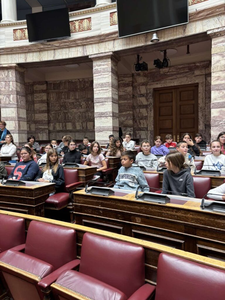 Οι μικροί μας επισκέπτες είχαν την ευκαιρία να καθίσουν στα έδρανα των Βουλευτών στην Αίθουσα της Ολομέλειας, γεγονός που τους εντυπωσίασε.