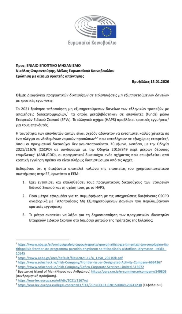 Θέμα: Διαφάνεια πραγματικών δικαιούχων σε τιτλοποιήσεις μη εξυπηρετούμενων δανείων με κρατικές εγγυήσεις