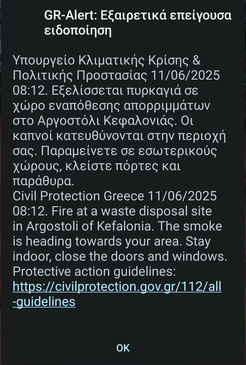 Νωρίτερα μάλιστα ήρθε και μήνυμα από το 112 στα κινητά προειδοποιόντας για επικίνδυνους καπνούς και συστήνοντας στους κατοίκους να παραμείνουν στο σπίτια τους με κλειστά παράθυρα και πόρτες.