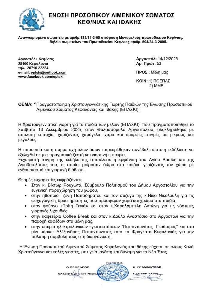 Χριστουγεννιάτικη γιορτή παιδιών της Ένωσης Προσωπικού Λιμενικού Σώματος Κεφαλονιάς και Ιθάκης (ΕΠΛΣΚΙ)