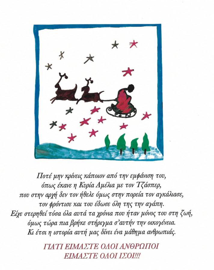Το ξεχωριστό κομμάτι της εκδήλωσης ήταν η παρουσίαση ενός παραμυθιού από δύο ωφελούμενες του ΚΔΗΦ την Χρυσή Αντωνάτου στην συγγραφή και την Κατερίνα Γιαννακοπούλου στην  εικονογράφηση. Η αρχή αυτής της διαδικασίας ήταν μια ιδέα στις πρωινές συναντήσεις ομάδας ωφελούμενων που μέσα από συνεργασία, ομαδικότητα και πολλή αγάπη έγινε βιβλίο – παραμύθι. Τίτλος του παραμυθιού «Το Χριστουγεννιάτικο μήνυμα και η Βοήθεια των Χριστουγέννων».