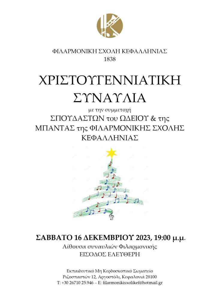 HomeΜουσική & ΧορόςΧριστουγεννιατική γιορτή σπουδαστών Ωδείου & μπάντας Κεφαλληνίας το Σάββατο 16 Δεκεμβρίου