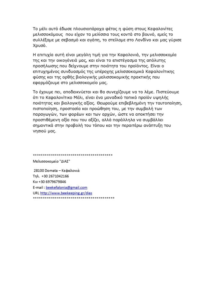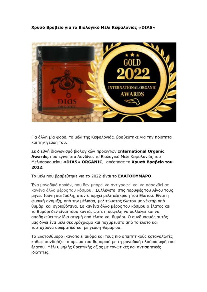Χρυσό Διεθνές Βραβείο για το Βιολογικό Μέλι Κεφαλονιάς