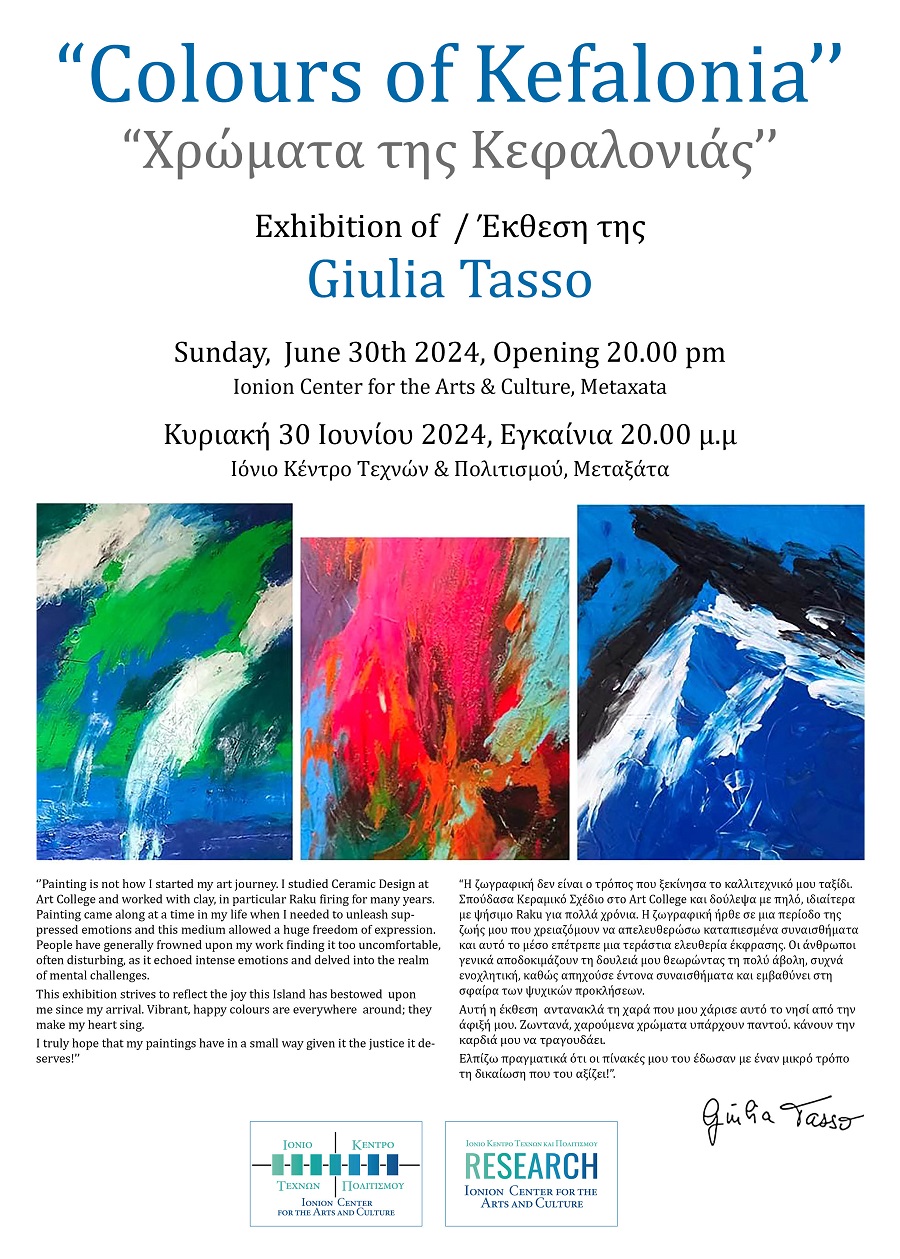 HomeΠολιτισμός“Χρώματα της Κεφαλονιάς-Colours of Kefalonia” έκθεση της Giulia Tasso την Κυριακή 30 Ιουνίου στα Μεταξάτα