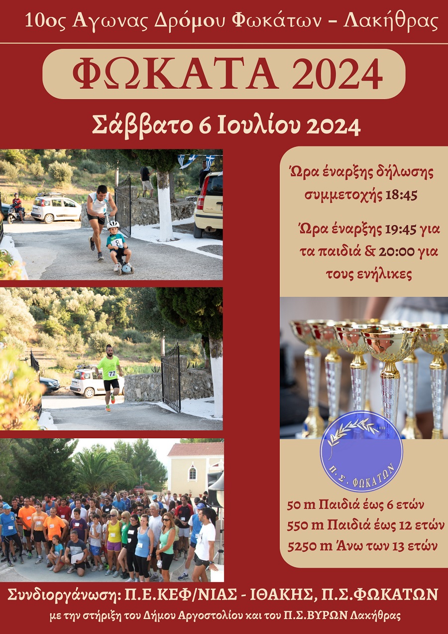 Ο Π.Σ . Φωκάτων με την Περιφέρεια Ιονίων Νήσων  Π.Ε. Κεφαλληνίας και Ιθάκης  συνδιοργανώνει τον  10ο  αγώνα δρόμου στα Φωκάτα   το Σάββατο 6  Ιουλίου  και ώρα 19.45  με την στήριξη του Δήμου Αργοστολίου  και του Πολιτιστικού Συλλόγου Βύρων Λακήθρας.