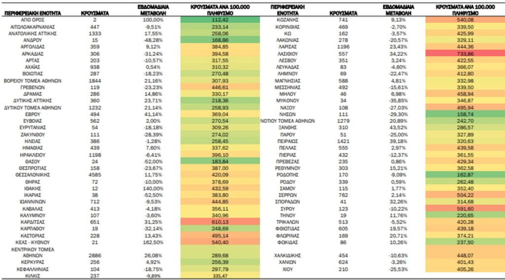 Την εβδομάδα αναφοράς καταγράφηκαν 36.146 κρούσματα COVID-19 (3.465 ανά εκατoμμύριο πληθυσμού: 7% εβδομαδιαία μεταβολή) εκ των οποίων οι επαναλοιμώξεις αφορούν το 24% των λοιμώξεων. Ο συνολικός αριθμός των λοιμώξεων από την έναρξη της πανδημίας ανέρχεται σε 4.875.215 εκ των οποίων 52.0% γυναίκες.