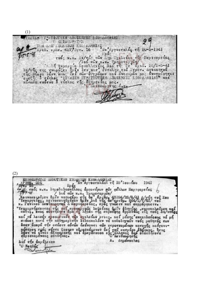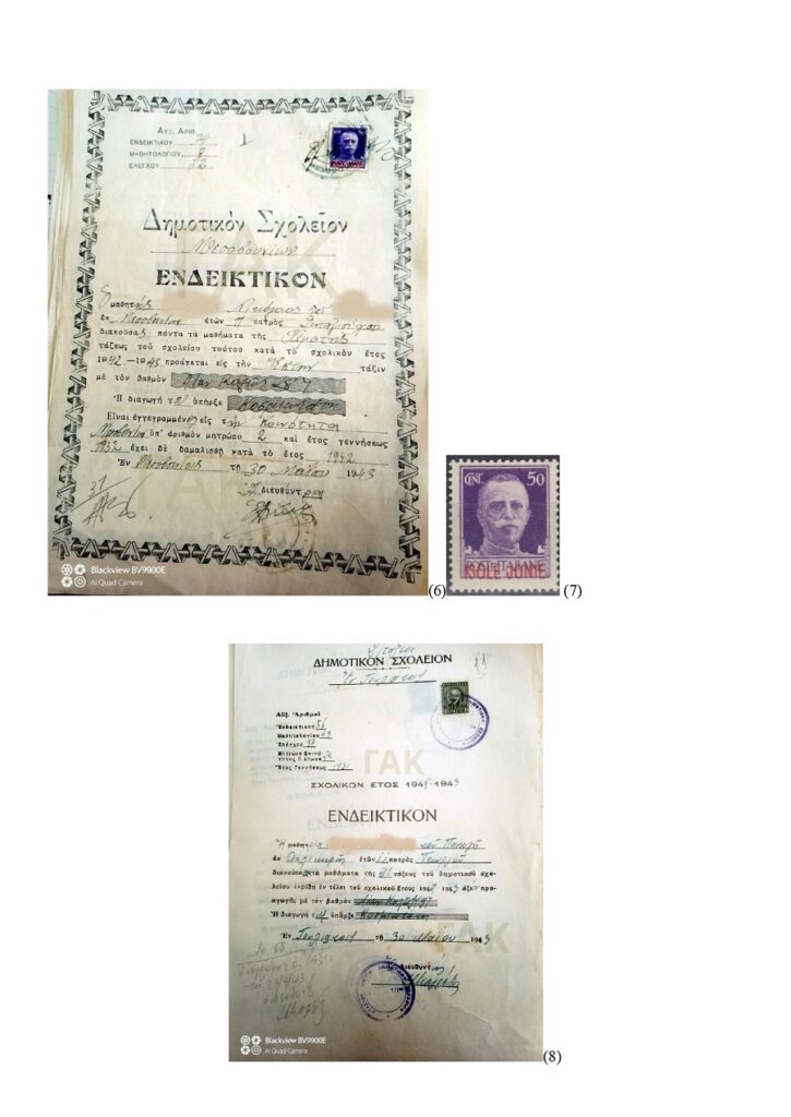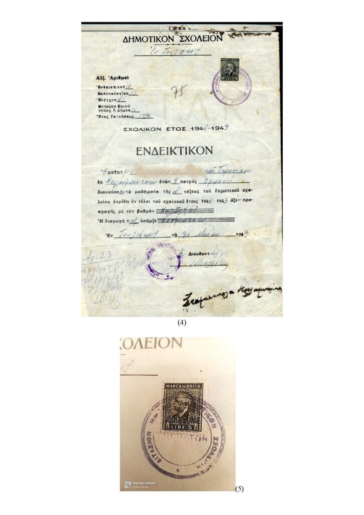 Παραθέτουμε τα σχετικά έγγραφα  καθώς και Τίτλους Προόδου (ενδεικτικά)  μαθητών της εποχής που φέρουν ιταλικά γραμματόσημα ως χαρτόσημα, με αναγραφή ISOLE JONIE. Η υποχρεωτική χρήση αυτών έγινε με το διάταγμα 97/25-3-1942 του Αρχηγού Πολιτικών Υποθέσεων των Ιονίων Νήσων Πιέρο Παρίνι. Στα ενδεικτικά παραλειπόταν βεβαίως το πολιτειακό έμβλημα του «Βασιλείου της Ελλάδος» και ακόμη δεν αναφέρεται ο όρος «Ιταλική Στρατιωτική Διοίκησις Κεφαλληνίας» (4),(5),(6),(7),(8)