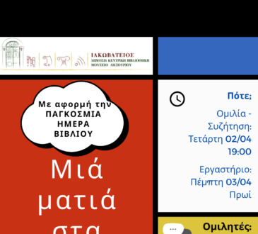 ΠολιτισμόςΠαγκόσμια Ημέρα Βιβλίου-Διήμερο για τα Graphic Novels 2 και 3 Απριλίου στην Ιακωβάτειο Βιβλιοθήκη1 Απριλίου, 20251 Απριλίου, 2025Πολιτισμός205 viewsΠΑΓΚΟΣΜΙΑ ΗΜΕΡΑ ΒΙΒΛΙΟΥ ΔΙΗΜΕΡΟ ΓΙΑ ΤΑ GRAPHIC NOVELS 2 και 3 Απριλίου 2025 Η Ιακωβάτειος Βιβλιοθήκη γιορτάζει την Παγκόσμια...