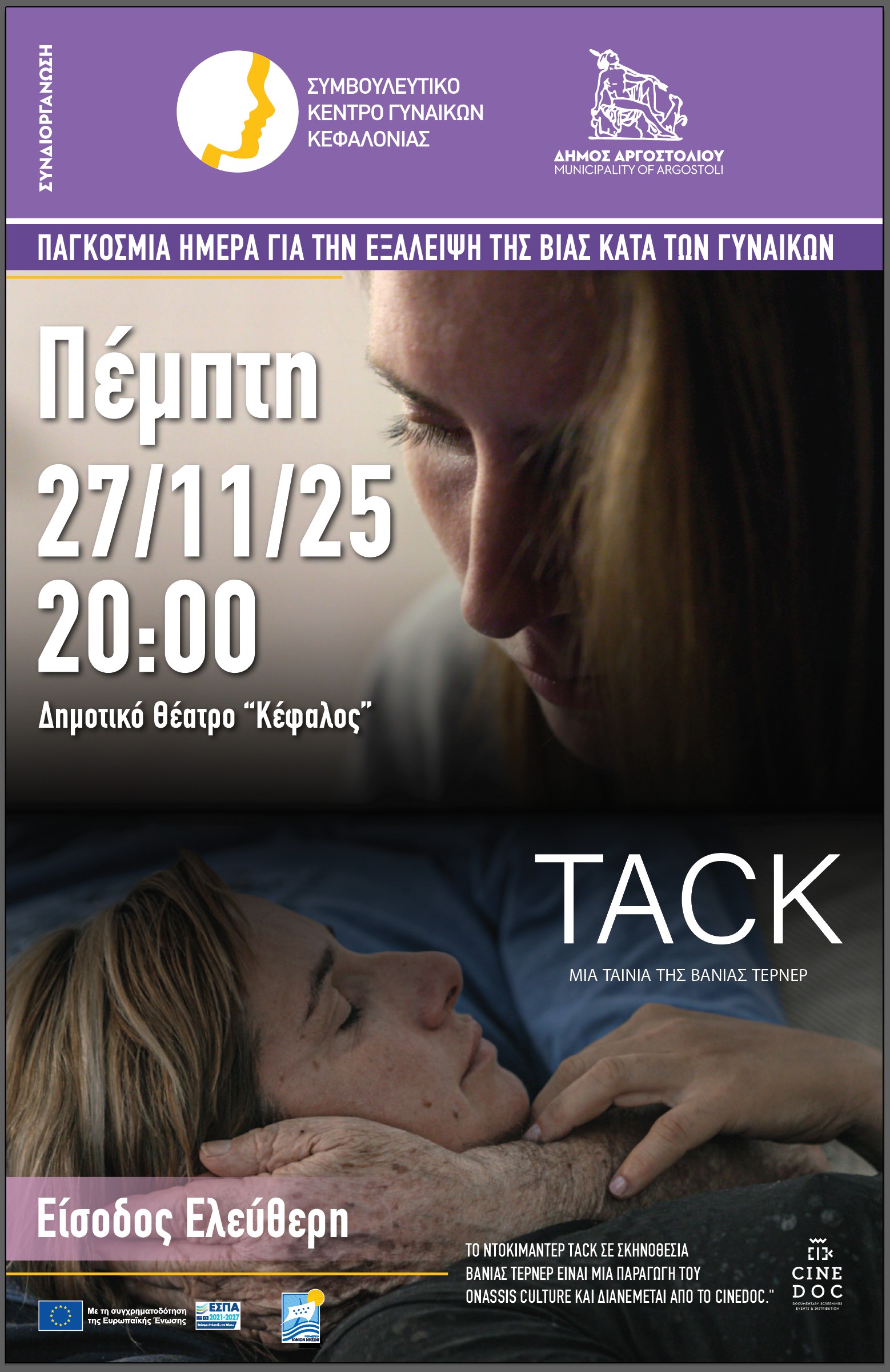 Την Πέμπτη 27 Νοεμβρίου στις 20:00 στο Δημοτικό Θέατρο «ο Κέφαλος» θα γίνει προβολή του ντοκιμαντέρ TACK. Η είσοδος θα είναι ελεύθερη για το κοινό. Το ντοκιμαντέρ TACK σε σκηνοθεσία Βάνιας Τέρνερ είναι μια παραγωγή του ONASSIS CULTURE και διανέμεται από το Cinedoc.