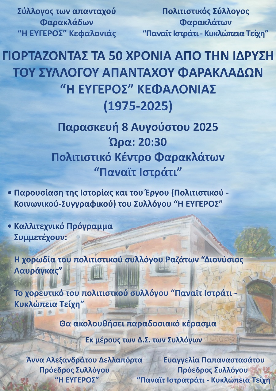 Ο Πολιτιστικός Σύλλογος των Απανταχού Φαρακλάδων “Η ΕΥΓΕΡΟΣ” Κεφαλλονιάς και ο Πολιτιστικός Σύλλογος Φαρακλάτων “ΠΑΝΑΪΤ ΙΣΤΡΑΤΙ – ΚΥΚΛΩΠΕΙΑ ΤΕΙΧΗ” σας προσκαλούμε να μας τιμήσετε με την παρουσία σας στην εκδήλωση για τα 50 χρόνια από την ίδρυση του Συλλόγου των Απανταχού Φαρακλάδων “Η ΕΥΓΕΡΟΣ” Κεφαλλονιάς (1975 – 2025) που θα γίνει στο Πολιτιστικό Κέντρο Φαρακλάτων “Πανάιτ Ιστράτι” την Παρασκευή 8 Αυγούστου 2025 στις 8.30΄μ.μ.