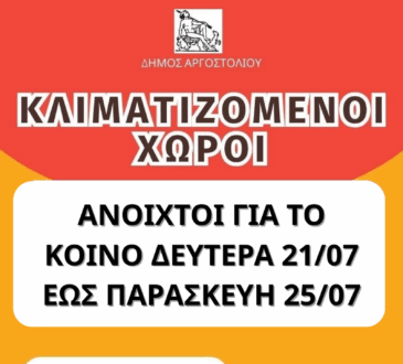 ΚοινωνίαΟι κλιματιζόμενοι χώροι για τους πολίτες στον Δήμο Αργοστολίου από Δευτέρα 21/7 έως Παρασκευή 25/721 Ιουλίου, 2025Κοινωνία220 viewsΟι κλιματιζόμενοι χώροι για τους πολίτες στον Δήμο Αργοστολίου από Δευτέρα 21/7 έως Παρασκευή 25/7 Λόγω των υψηλών θερμοκρασιών που...