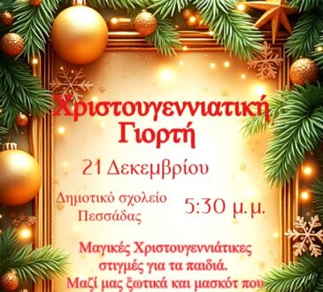 ΚοινωνίαΠολιτισμόςΣήμερα το Άναμμα του Χριστουγεννιάτικου Δέντρου στην Πεσσάδα21 Δεκεμβρίου, 2025ΚοινωνίαΠολιτισμός147 viewsΣήμερα το Άναμμα του Χριστουγεννιάτικου Δέντρου στην Πεσσάδα ΚΥΡΙΑΚΗ 21 ΔΕΚΕΜΒΡΙΟΥ Στην Πεσσάδα στο πρώην Δημοτικό σχολείο, ώρα 5.30μμ. Άναμμα...