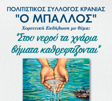 Μουσική & ΧορόςΠολιτισμόςΧορευτική παράσταση του Πολιτιστικού Συλλόγου Ο Μπάλλος: «Στου νερού τα χνάρια βήματα καθρεφτίζονται» την Κυριακή 20 Ιουλίου στο Ξενία16 Ιουλίου, 2025Μουσική & ΧορόςΠολιτισμός214 views«Στου νερού τα χνάρια βήματα καθρεφτίζονται» Ο Πολιτιστικός Σύλλογος Επαρχίας Κρανιάς «Ο ΜΠΑΛΛΟΣ» σας προσκαλεί στην καθιερωμένη πολιτιστική-χορευτική του εκδήλωση αφιερωμένη στο...