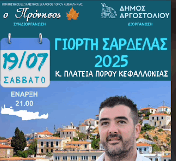 Μουσική & ΧορόςΚάλεσμα για τη μεγάλη Γιορτή Σαρδέλας το Σάββατο 19 Ιουλίου στον Πόρο Κεφαλονιάς!14 Ιουλίου, 202514 Ιουλίου, 2025Μουσική & Χορός342 viewsΚάλεσμα για τη μεγάλη Γιορτή Σαρδέλας το Σάββατο 19/7 στον Πόρο Κεφαλονιάς! Είστε όλοι σας καλεσμένοι στη μεγάλη Γιορτή Σαρδέλας...