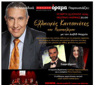 Μουσική & ΧορόςΜουσική Βραδιά Νοσταλγίας στην Πάτρα με «Ελληνικές Καντσονέτες του Μεσοπολέμου» από τον Δαυίδ Ναχμία16 Ιουλίου, 2025Μουσική & Χορός176 viewsΜουσική Βραδιά Νοσταλγίας στην Πάτρα με «Ελληνικές Καντσονέτες του Μεσοπολέμου» από τον Δαυίδ Ναχμία Το περιοδικό «Πατρινόραμα» σας προσκαλεί σε...