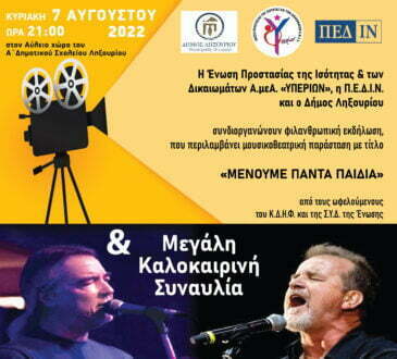 Μουσική & ΧορόςΠολιτισμόςΚαλοκαιρινή Φιλανθρωπική εκδήλωση του “Υπερίων” την Κυριακή 7 Αυγούστου στον αύλειο χώρο του Ά Δημοτικού Ληξουρίου3 Αυγούστου, 20223 Αυγούστου, 2022Μουσική & ΧορόςΠολιτισμός419 viewsΠρόσκληση στην Καλοκαιρινή μας Φιλανθρωπική εκδήλωση την Κυριακή 07/08/2022 στον αύλειο χώρο του Ά Δημοτικού Ληξουρίου. Το Δ.Σ. της Ένωσης...