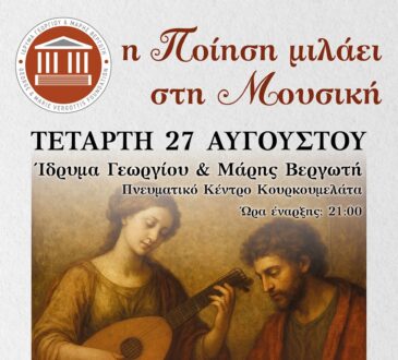 Μουσική & ΧορόςΠολιτισμόςΣυναυλία “Η Ποίηση μιλάει στη Μουσική”, Τετάρτη 27 Αυγούστου στα Κουρκουμελάτα25 Αυγούστου, 2025Μουσική & ΧορόςΠολιτισμός161 viewsΤο Ίδρυμα Γεωργίου και Μάρης Βεργωτή παρουσιάζει τη συναυλία «Η Ποίηση μιλάει στη Μουσική», η οποία θα πραγματοποιηθεί στο Πνευματικό...