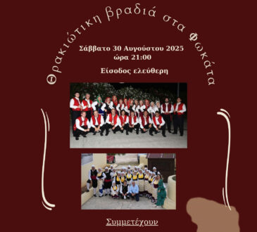 Μουσική & ΧορόςΠολιτισμόςΘρακιώτικη βραδιά στα Φωκάτα28 Αυγούστου, 202528 Αυγούστου, 2025Μουσική & ΧορόςΠολιτισμός233 viewsΣας προσκαλούμε το Σάββατο 30 Αυγούστου 2025 και ώρα 21.00 στην «Θρακιώτικη Βραδιά στα Φωκάτα» . Μια μοναδική βραδιά γεμάτη...