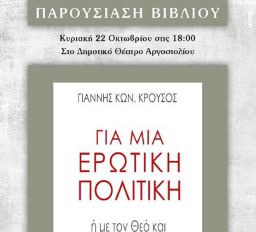 ΔΙΑΦΟΡΑ“Για μια ερωτική πολιτική” παρουσίαση βιβλίου την Κυριακή 22 Οκτωβρίου στον “Κέφαλο”21 Οκτωβρίου, 2023ΔΙΑΦΟΡΑ213 views Κυριακή, 22 Οκτωβρίου, 6μμ, Δημοτικό Θέατρο, Αργοστόλι Δεν είναι πρόσκληση για την παρουσίαση ενός βιβλίου, αλλά για την παρουσίαση μιας...